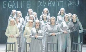 (per lo più atonali) – come peraltro tutta la produzione del compositore francese – permeata com’è da una poetica che trova nell’atmosfera cupa, oppressiva e tragica in cui si sviluppa l’azione una perfetta rispondenza. Nel convento si riproduce paradossalmente la stessa oppressione psicologica fatta di obbedienza e sottomissione che viene praticata sulla società dal governo nella Francia rivoluzionaria al tempo del terrore. Nell’opera si ritrovano alcuni dei temi fondamentali dell’angoscia spirituale dei credenti di fronte alla morte, la vera protagonista dell’opera, rappresentata da un lato dal tormento della superiora di fronte alla fine fra la sua spiritualità e l’ignoto e dall’altro dall’accettazione del martirio come suprema testimonianza del proprio credo. L’esemplificazione di quest’ultima realtà è impersonata dalla figura della protagonista Blanche, personaggio che trova la propria cifra non in un’accettazione acritica del suo destino ma nello sviluppo – talvolta controverso – di una consapevolezza che la porterà alla decisione finale. Bene ha fatto quindi il teatro Comunale a presentare un’opera fondamentale del ‘900, rappresentata in prima assoluta alla Scala nel 1957 e per la prima volta a Bologna. Enucleare le singole performances dei cantanti sarebbe erroneo, perché si tratta di opera corale: a tutti va un plauso incondizionato a fronte di una partitura spesso impervia. E del tutto accettabile è la scenografia, ridotta al minimo, costituita da pannelli che scorrono, tutti dello stesso grigio che caratterizza l’abito delle monache; centrato è lo scorcio che si intravede di alberi che ricordano il mondo cui le monache hanno volontariamente rinunciato. Non tutto è perfetto: le sagome di compensato che dovrebbero ricordare gli ambienti ecclesiastici sono un po’ velleitarie (e in certi casi di difficile interpretazione) e l’abito del fratello di Blanche in occasione dell’ultimo saluto pare più quello di un commesso viaggiatore del ’90o che quello di un nobile settecentesco. Irritanti gli strafalcioni di ortografia e di latino dei sopratitoli. Bellissima invece la scena finale con le monache che ad una ad una scompaiono durante la recitazione del Salve Regina con lo sfondo di una notte stellata. In somma uno spettacolo di qualità ben al di sopra della media di quelli del teatro: che si possa ben sperare per il futuro?