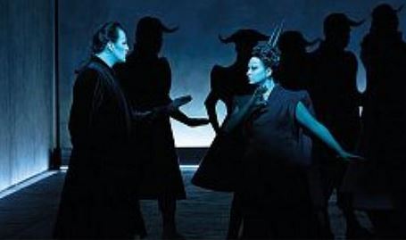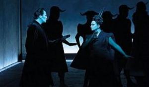 Come recita Orazio nell’ “Ars Poetica” Parturiunt montes (Wilson) nascitur minusculus mus (Trovatore). Siamo al minimalismo puro dove tutto è giocato sulle ombre e le luci (ci si ricorda del Macbeth?) in un palcoscenico rigorosamente vuoto (fra un po’ anche i cantanti saranno avatar tridimensionali sintetizzati da un computer). Immersi in una luce biancazzurra con i volti direttamente illuminati i protagonisti si muovono per lo più con gesti a scatto come marionette quasi a simboleggiare che non sono protagonisti veri ma burattini di un destino che non possono controllare. Quello che nella intenzione del librettista sarebbe uno svolgimento (se così si può chiamare l’azione) temporale è qui riportato in una visione orizzontale dove passato e presente si fondono quasi a simboleggiare l’assenza di qualsiasi significato. Sullo sfondo si muovono gli elementi del coro che via via rappresentano le schiere del conte di luna, dei gitani o di Manrico (che riesce a portarsi via la bella Leonora mentre il conte assiste passivo – potenza dell’assurdità dell’opera peraltro sperimentata anche nell’Ernani dove l’esigenza del concertato fa a pugni con la logica). Ma l’opera di straniamento di Wilson ha il fiato corto stemperandosi in una ripetitività che alla fine annoia. A questo concorrono le posizioni quasi sempre statiche dei protagonisti, una fissità che rimuove l’espressione che dovrebbe accompagnare quanto espresso dal canto. E nulla si può dire dei costumi se non di quelle inserzioni oniriche di figurette che potrebbero sbucare da un quadro surrealista di Dalì e che costituiscono l’unico elemento ravvivante di uno spettacolo desolante. Si aggiunga la presenza all’inizio dei due atti di un vecchietto con una lunga barba bianca seduto in palcoscenico la cui funzione (colpa della incapacità del sottoscritto) è assolutamente ignota se non dal punto di vista estetico. A tutto questo va aggiunta una sorta di avanspettacolo all’inizio della seconda parte dell’opera costituito da un’esibizione di pugili usciti da un quadro di bagnanti impressionistico a cavallo fra XIX e XX secolo. L’esibizione “pugilistica” dura un buon quarto d’ora con rumoreggiamenti del pubblico e parrebbe compensare l’assenza del balletto della versione francese. Pura estetica senza alcun riferimento all’opera. Mah.