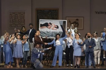 Il nido d’amore di Violetta e Alfredo è una casa borghese nella quale Violetta sfoglia svogliatamente un rotocalco. Le zingarelle del secondo quadro del secondo atto sono delle giunoniche matrone che leggono la mano (?) mentre continua a essere sballottato il povero quadro che viene persino aggredito dall’Alfredo furente. In un momento di iperrealismo Giorgio Germont molla un sonoro ceffone ad Alfredo che se ne va con una ignota signorina che l’accompagnerà anche da Violetta morente nel terzo atto. Chi sia non è dato saperlo (ma neppure il regista lo sa).