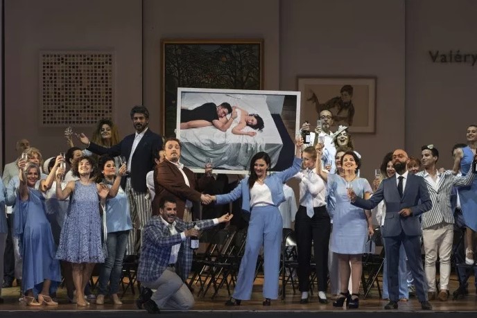 ….verdiano non sfegatato la Traviata è certamente un capolavoro assoluto ed è uno dei pochissimi casi in cui il libretto è molto migliore dell‘originale. „La dame aux camélias“ di Alexandre Dumas è un orribile polpettone strappacore oggi praticamente illeggibile. La versione operistica, invece, ha una sua logica ed eleganza e questo contribuisce alla qualità complessiva dell‘opera. Inutile dire che ammannire ripetutamente l‘opera a breve distanza è organizzativamente più che discutibile ma commentare questo fatto è come sparare sulla croce rossa. Gli organizzatori del teatro dovrebbero seguire un corso base di storia della musica per „scoprire“ quanti capolavori sono semplicemente trascurati e non è che un premio – sbandierato come una promozione – cambi il quadro. „Una rondine non…“ recita l‘adagio. Siamo tutti in attesa di vedere il Tristano di apertura del prossimo anno per il quale – si dice – la sponsorizzazione al momento ammonterebbe a 100.000 (centomila) euro (se qualcuno li paga….). Ma veniamo a Violetta Valery e al suo Alfredo che per lei spasima da un anno. Inutile ricordare la storia: Violetta è una „escort“ d‘alto bordo dal cuore tenero e generoso e Alfredo uno scioccone che non si accorge di nulla. Quanto al padre Giorgio Germont ci troviamo di fronte a un rezionario ottuso dell“ancient régime“  che come Alfredo, alla fine, capisce come „passata è la faccenda“ e si pente quando ormai é troppo tardi. “Violetta l’è propi un anzelen“  (in bolognese (è proprio un angelino) sentii dire molti anni fa in loggione. La Traviata proposta dalla regia di Andrea Bernard è semplicemente demenziale, come peraltro ci si poteva aspettare da un regista (?) proveniente dalla corte dei miracoli di Damiano Michieletto che in nome di un malinteso sforzo di rivisitazione del panorama operistico ci ha ammannito negli anni (e non solo in Italia _ spesso esportiamo il peggio purtroppo) alcune delle più ignobili regie degli ultimi tempi: il povero Bernard è solo un pessimo e dilettantesco epigono del cattivo maestro. E naturalmente poiché il “trash” nella nostra società ha sempre più successo si pagano cachets colossali ad alfieri del pessimo gusto (nel caso in questione per una regia già brutalmente “buhata” nel 2017): nel palmarès del teatro bolognese ci sono anche altri innominabili esempi come il famigerato Ratto dal Serraglio (errare humanum est…). Mettere un dito nell’occhio dello spettatore è diventato ormai un titolo di merito. (Per gli amanti del nonsense si rimanda alle dichiarazioni programmatiche del regista reperibili su questo sito, frutto di una contorsione mentale da neurodeliri). Altro che dissacrazione: qui siamo semplicemente nel campo della presa per i fondelli e aspettiamo ansiosamente una Traviata allestita in un bordello, con Violetta nel doppio ruolo di tenutaria e “operatrice”, Alfredo protettore e Giorgio Germont cliente attempato, il tutto condito da esplicite scene di sesso (mamma mia, non vorrei avere dato un cattivo suggerimento!!). Al momento siamo in una casa d’aste che ovviamente è il contesto naturale per Traviata. Notoriamente nelle case d’aste si brinda, si va a cena ed è il luogo ideale per un idillio. Ovviamente c’è poi un quadro che fa da fil rouge di tutta l’opera incartato e scartato a più riprese e dal significato (si fa per dire) polivalente.