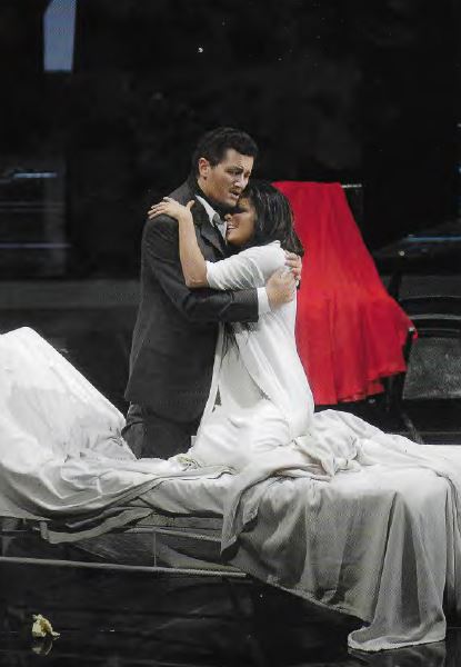 …di quante scenografie di Traviata sono cominciate con Violetta sul letto di morte durante l’ouverture? Anche questa versione non si sottrae alla tentazione (ma va ricordato che la Deutsche Oper tendenzialmente è molto più conservatrice della Staatsoper) con la variante che la malata resuscita improvvisamente alla fine dell’ouverture e aiutata da un inserviente di scena indossa un abito da sera mentre gli invitati entrano e il letto viene ricoperto da un drappo che lo trasforma in un divano. Per il resto tradizione sotto ogni aspetto con qualche caduta di stile quando nel corso della festa a casa di Flora quest’ultima viene agghindata come una maitresse e si esibisce in una sorta di corrida nella quale interpreta la parte del toro. Quanto a regia e scenografia null’altro da segnalare. Una messa in scena dignitosa per un pubblico che non vuole colpi di genio (veri, non alla Michieletto, che di genio non hanno nulla) e che partecipa emotivamente alla vicenda di Violetta.