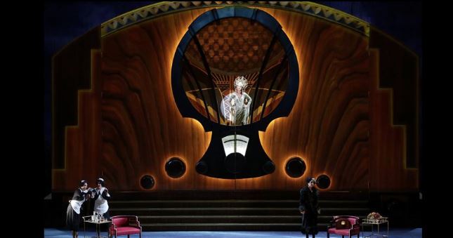 … capire le ragioni che hanno spinto un autore di di grande talento come Hofmannsthal a redigere un libretto di livello discutibile e Strauss accettare di scriverne la musica. Con una lontana riminiscenza euripidea questo mito secondario (non Elena ma un suo simulacro viene rapita a Troia – Paride doveva essere addirittura cieco!) dà luogo a una vicenda narrata dallo scrittore austriaco che mischia il desiderio di vendetta di Menelao (non portata a termine – siamo in perfetto “happy end” con tanto di figlia Ermione che si palesa improvvisamente alla fine del libretto) con atmosfere esoteriche, molluschi profetici, padre e figlio che vorrebbero contendersi la bella Elena, improvvisamente rapiti dalla sua bellezza e altre amenità di gusto francamente discutibile. Debbo confessare che dopo avere visto l’opera ho dovuto rileggermi il libretto per essere sicuro di averne carpito il significato! Ci vuole una grande regia e un grande scenografo per districarsi in mezzo alle assurdità di una storia senza capo né coda, checché ne dicano alcuni dotti esegeti nel libretto di sala. E infatti la storia viene riportata a tempi tendenzialmente moderni con il palcoscenico riempito da un colossale frontale di radio del primo novecento (v. foto – non c’è una sola foto disponibile in cui si veda correttamente il frontale) quale castello fatato che si apre per permettere di seguire l’azione teatrale.