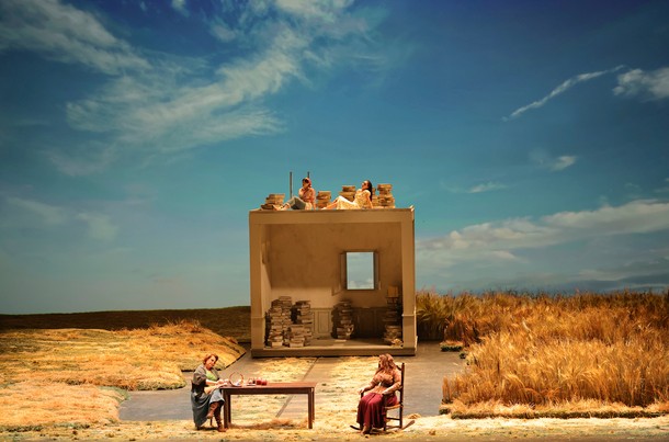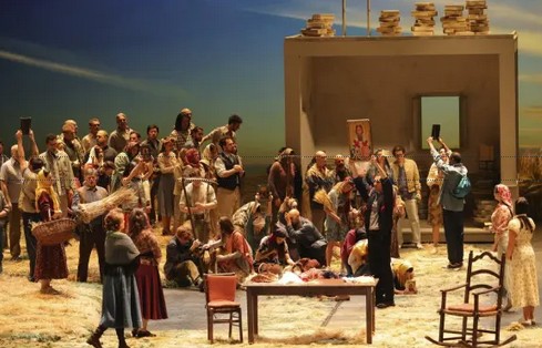 . . con alti e bassi. Il tentativo di interpretare la realtà del racconto di Puškin in modo meno convenzionale non è sempre stato felice. Ad esempio i quadri iniziali con una casupola piazzata in messo a un campo che sarebbe la stanza di Tatjana (e sul tetto della quale gorgheggiano Tat’jana e Olga) non è convincente e altrettanto dicasi per la festa di paese nel corso della quale ha luogo il duello fra Oneghin e Lenskij trasformato in una roulette russa reminiscente de “Il cacciatore” di Michael Cimino. Oneghin è vestito come un bellimbusto con abiti moderni a differenza degli altri protagonisti sulla scenza con abiti del periodo.
