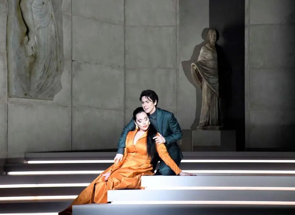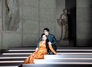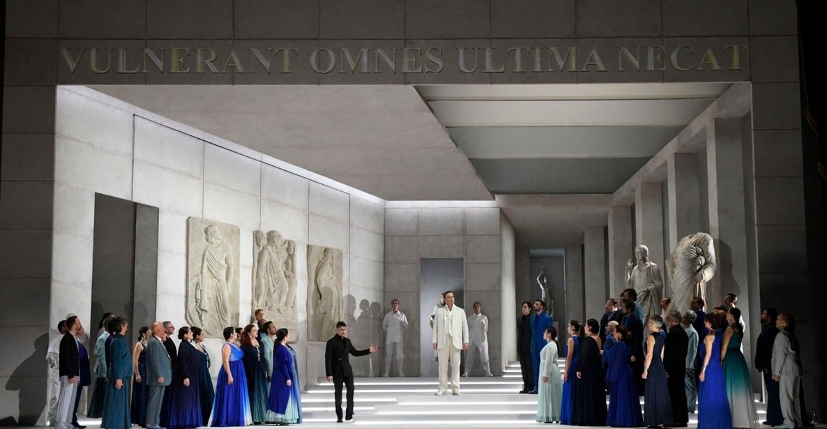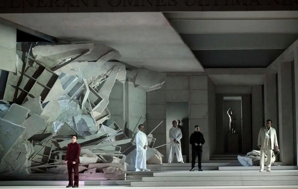 . .con uno spettacolo di altissima qualità. L’ultima opera di Mozart viene ambientata in uno scenario neoclassico sostanzialmente atemporale dove il freddo rigore delle scene è ravvivato dai personaggi e dal colore del loro abbigliamento. Ovviamente per il libretto siamo ben lontani dalla triade di Da Ponte e dall’ambientazione favolistica e massonica del Flauto Magico. E’ una storia molto banale e improbabile di tradimento e perdono prodotta per celebrare la magnanimità dell’imperatore.